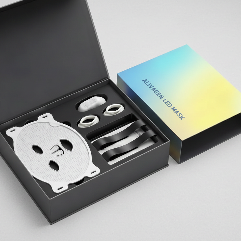 - Terapia a Luce Rossa a 7 Lunghezze d'onda: La nostra maschera RED LIGHT THERAPY Aliviagen™ Elyse stimola il collagene e l'elastina nel cuore dei mitocondri.