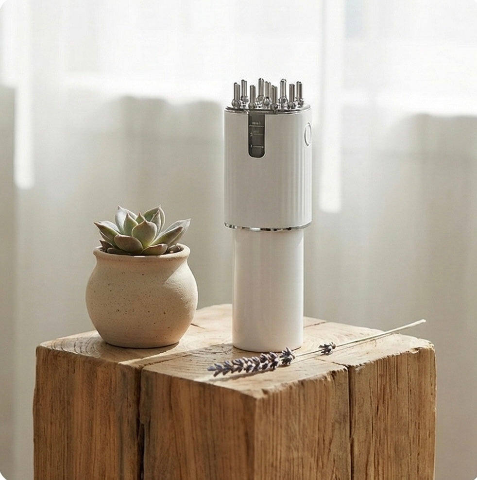 It is not a simple comb. It is the vital awakening of your scalp. Forget approximate manual friction and treatments that only stay on the surface. Aliviagen™ Flora fuses the precision of liquid application with the deep stimulation of energetic massage. Designed not just to counteract thinning, but to create a moment of profound relaxation where hair care becomes therapy for the mind. Nourish your hair starting from the root, aligning the health of your scalp with your inner balance.