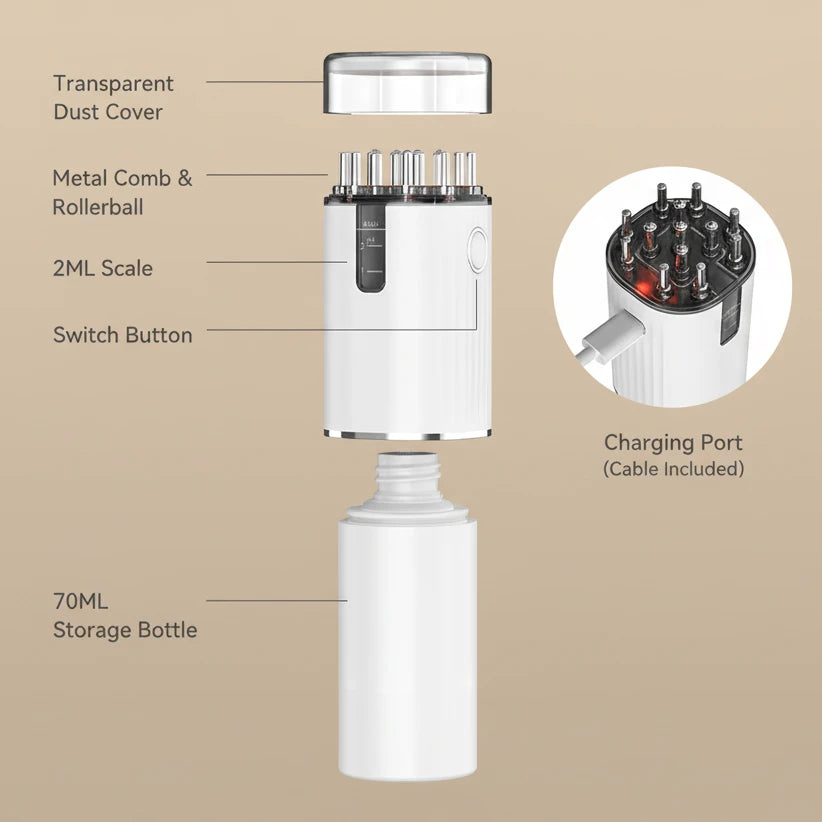 Crafted from high-grade materials that are oil-resistant and easy to sanitize, Flora features a transparent reservoir that allows you to monitor your growth elixir. Its ergonomic shape fits perfectly in the palm of your hand, allowing you to apply the ideal pressure effortlessly. It is your professional precision tool—compact and portable—for wellness that knows no boundaries.